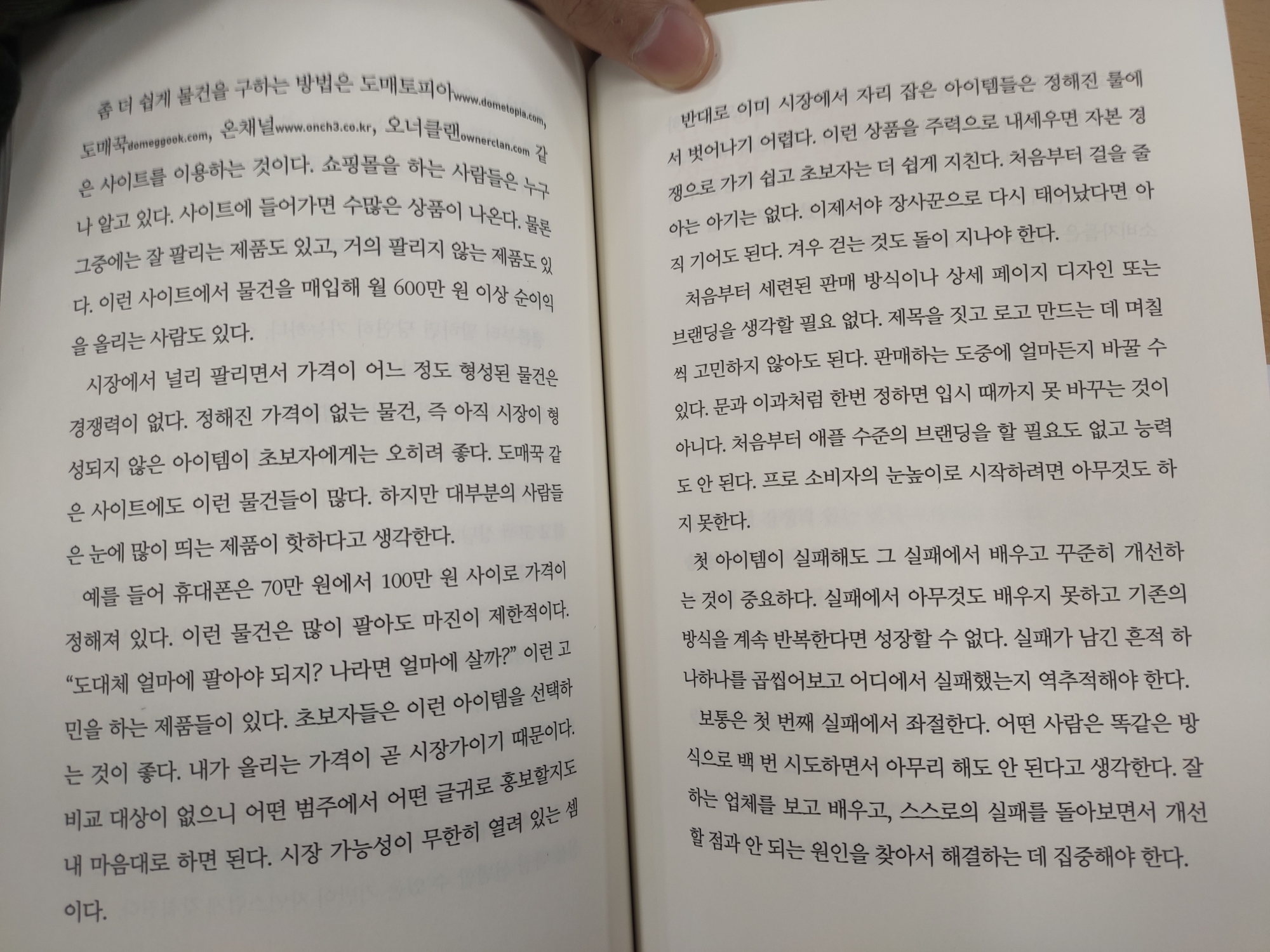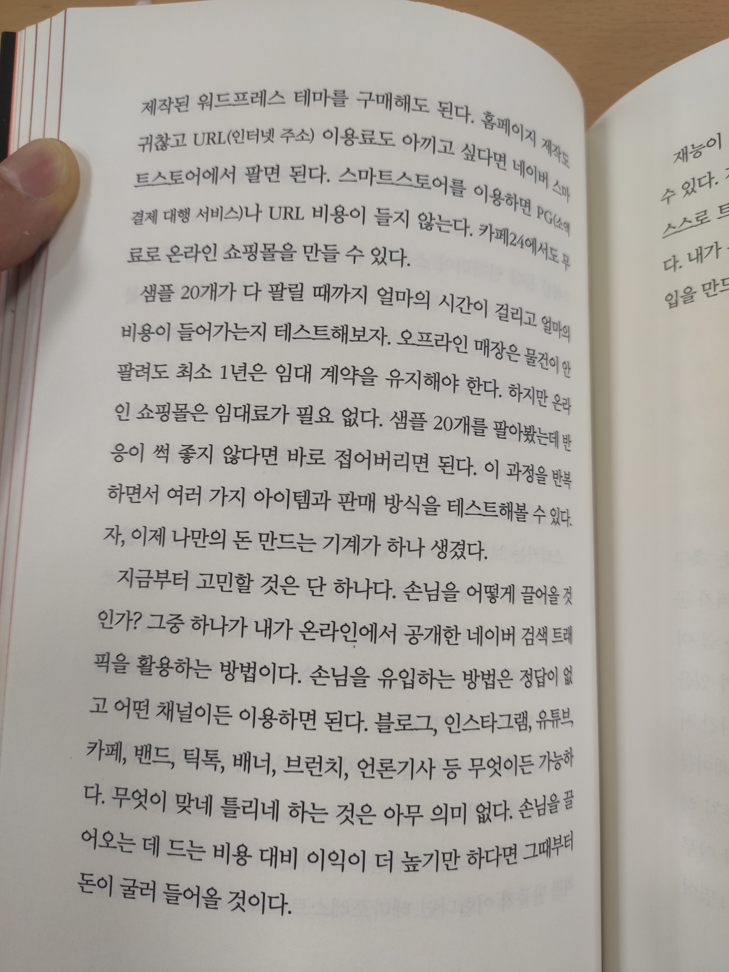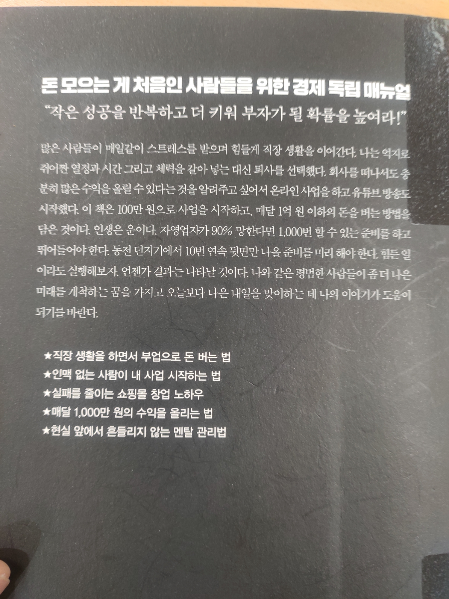 사이즈와 두께는 일반 책에 비해 얇아 천찬히 읽어도 2-3시간정도. 그의 삶의 과정과 마인드를 전반적으로 알 수 있는 그런 책이었고, 또한 그의 유튜브를 봤던 사람이라면 그의 유튜브 대화 내용 등이 책에 녹아들어가 있음을 알 수 있다.